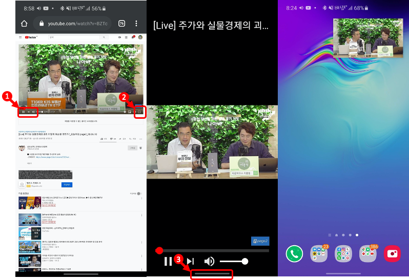 위에서와 같이 크롬에서 유튜브 데스크톱 사이트로 접속하시고 영상을 재생한 후 전체 화면으로 설정한 다음 홈 화면으로 빠져나오면