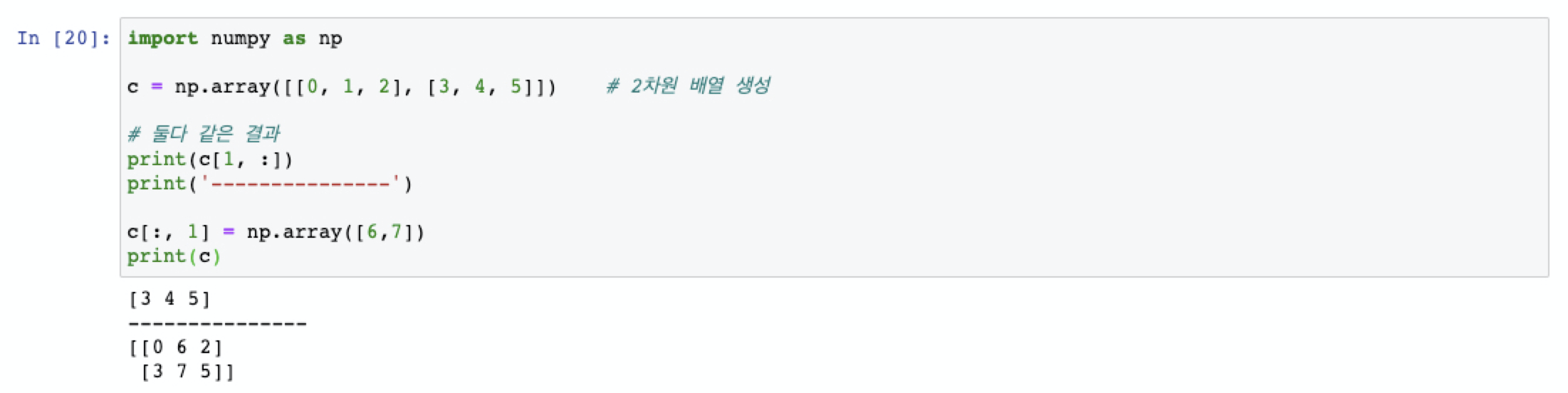 c = np.array([[0, 1, 2], [3, 4, 5]]) # 2차원 배열 생성