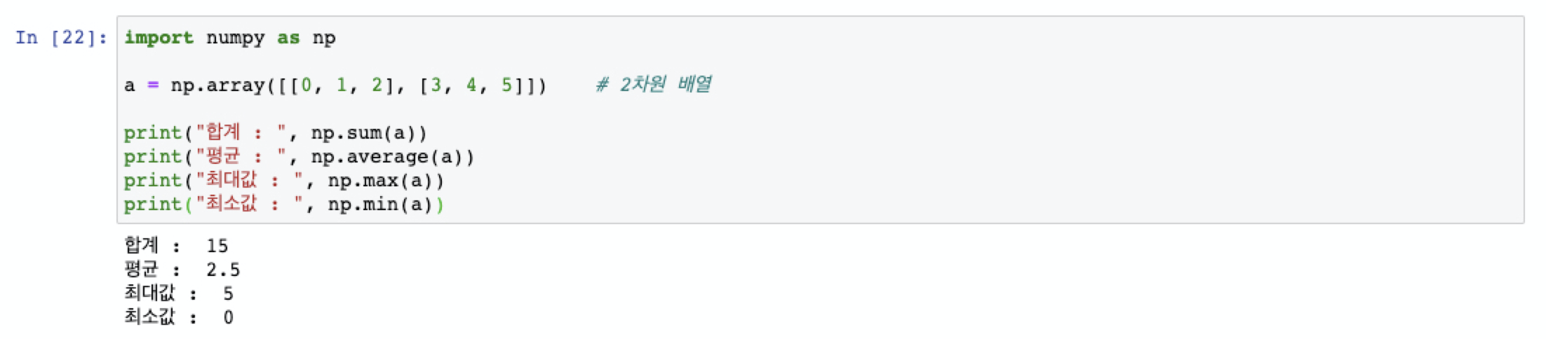 NumPy에서 합계, 평균, 최대값, 최소값은 아래 함수를 사용하면 간단하게 계산할 수 있습니다.