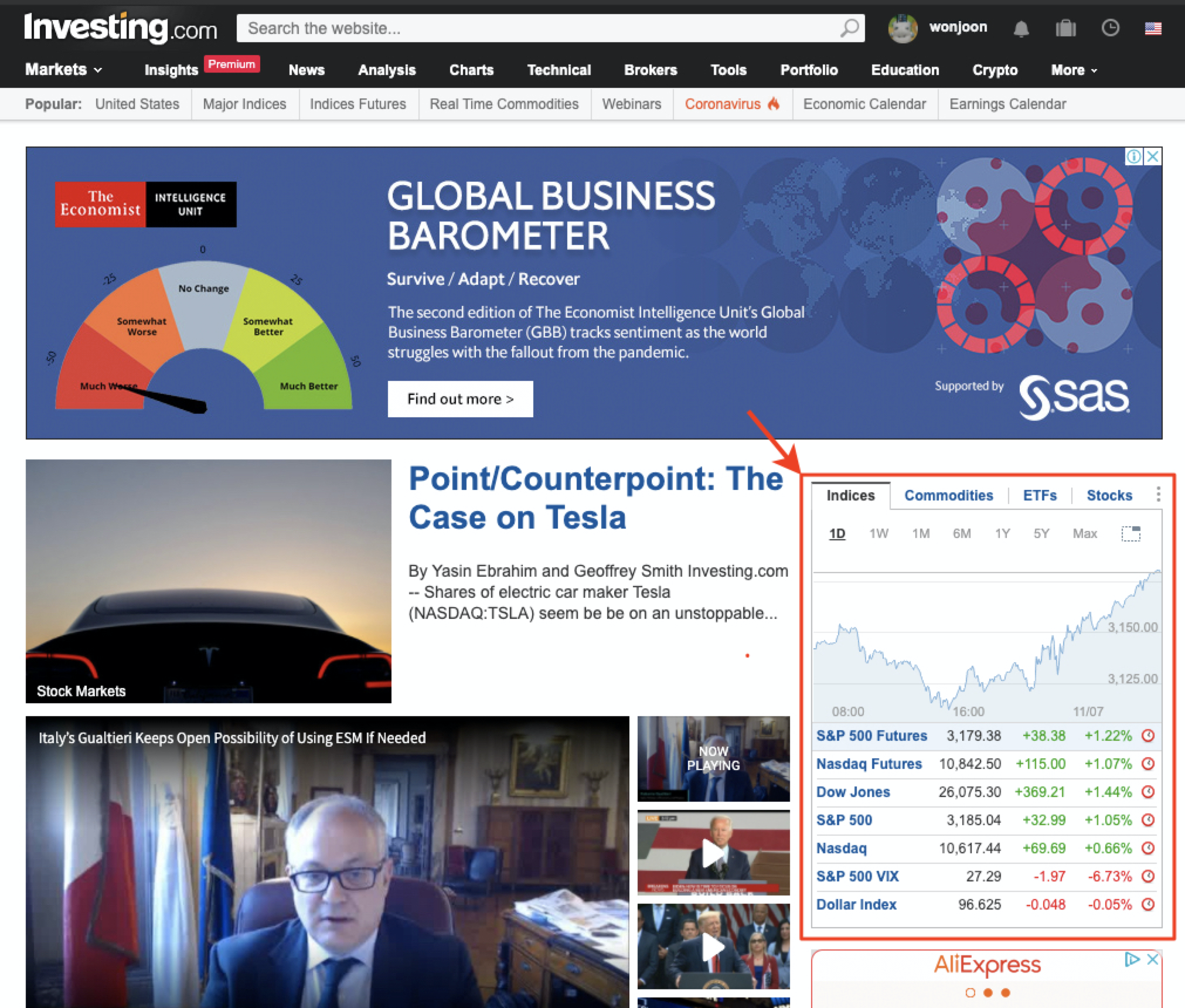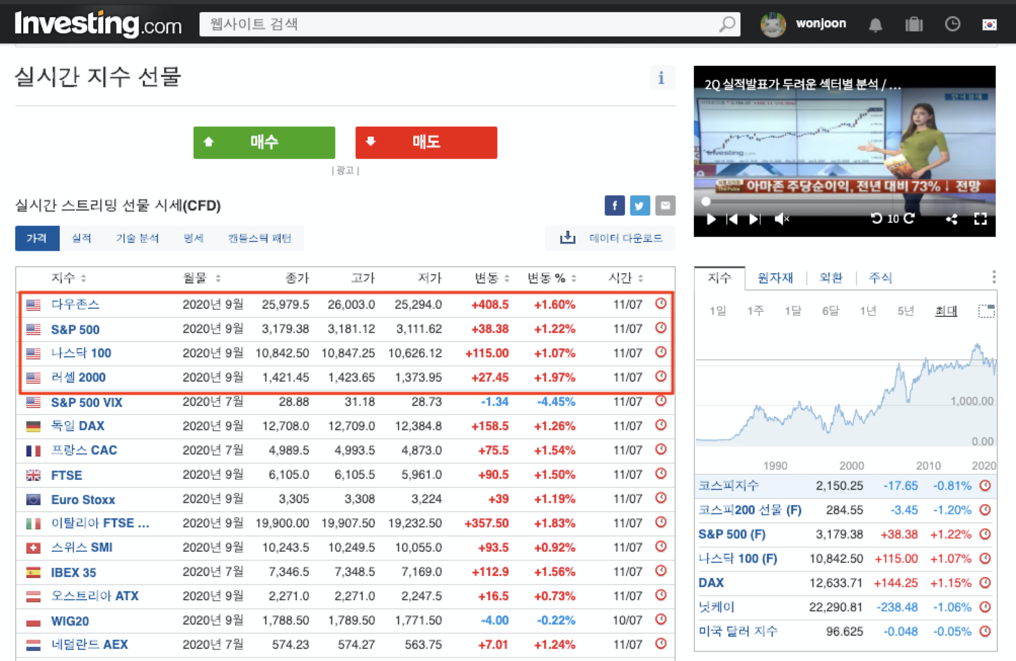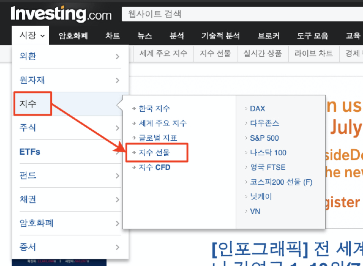 인베스팅 닷컴 메인 페이지에 접속하면 오른쪽 창에 선물지수를 확인할 수 있는 창이 나타납니다.
