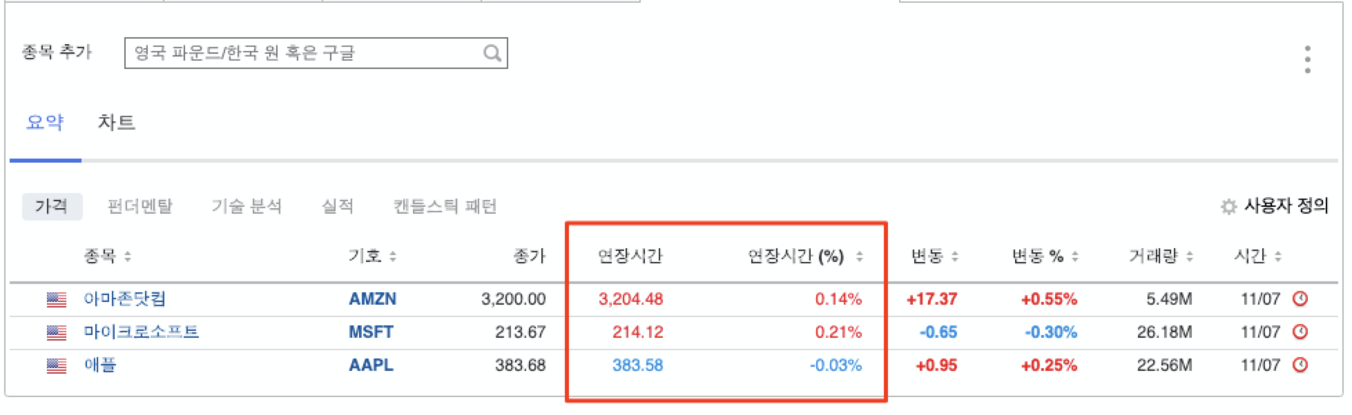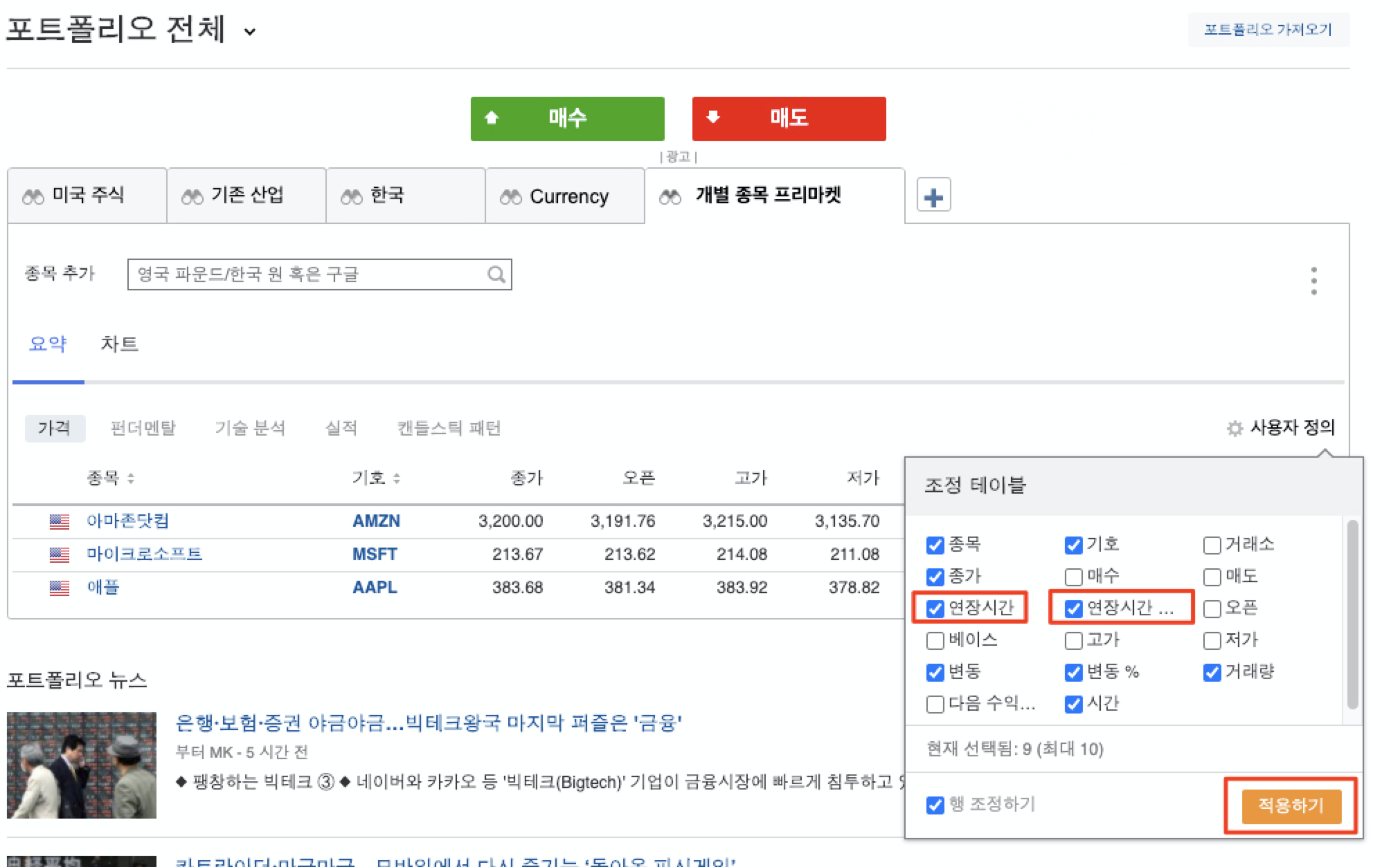 포트폴리오 -> [+] 포트폴리오 추가 -> 종목 추가 -> 사용자 정의 -> 연장시간 체크