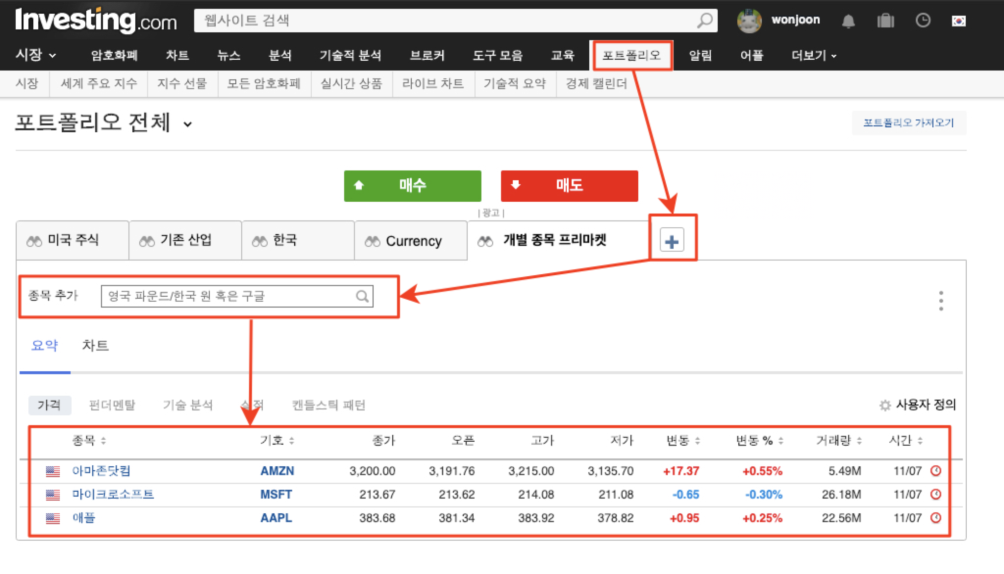 가입 후 개인 포트폴리오에 종목을 추가할 필요가 있습니다.