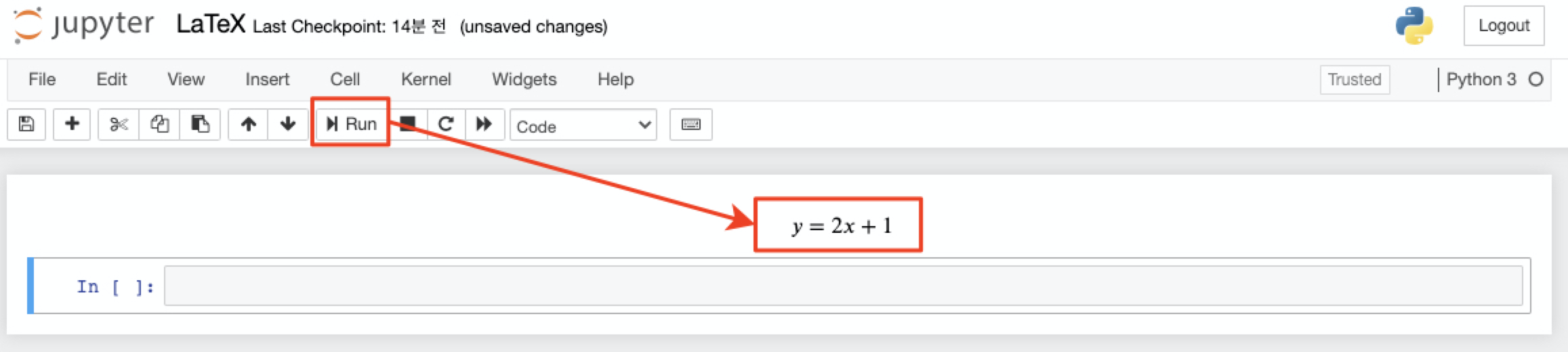 수식 작성 -> markdown 선택 -> Run 실행