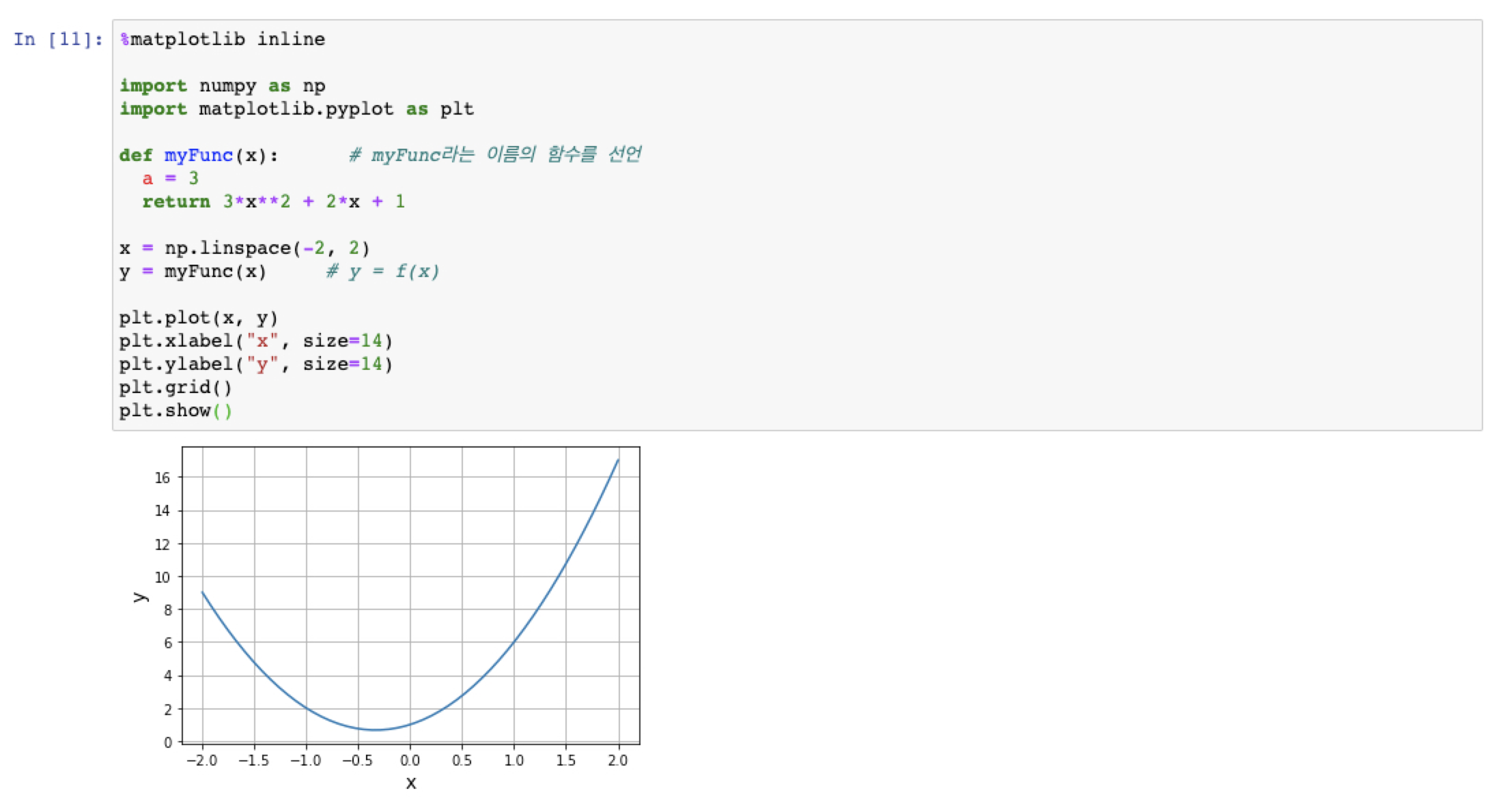 위 수식인 2차 다항식을 파이썬의 함수를 이용하여 구현해 보겠습니다.