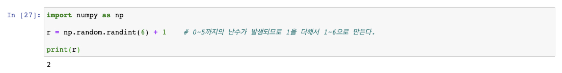 r = np.random.randint(6) + 1 # 0~5까지의 난수가 발생되므로 1을 더해서 1~6으로 만든다.