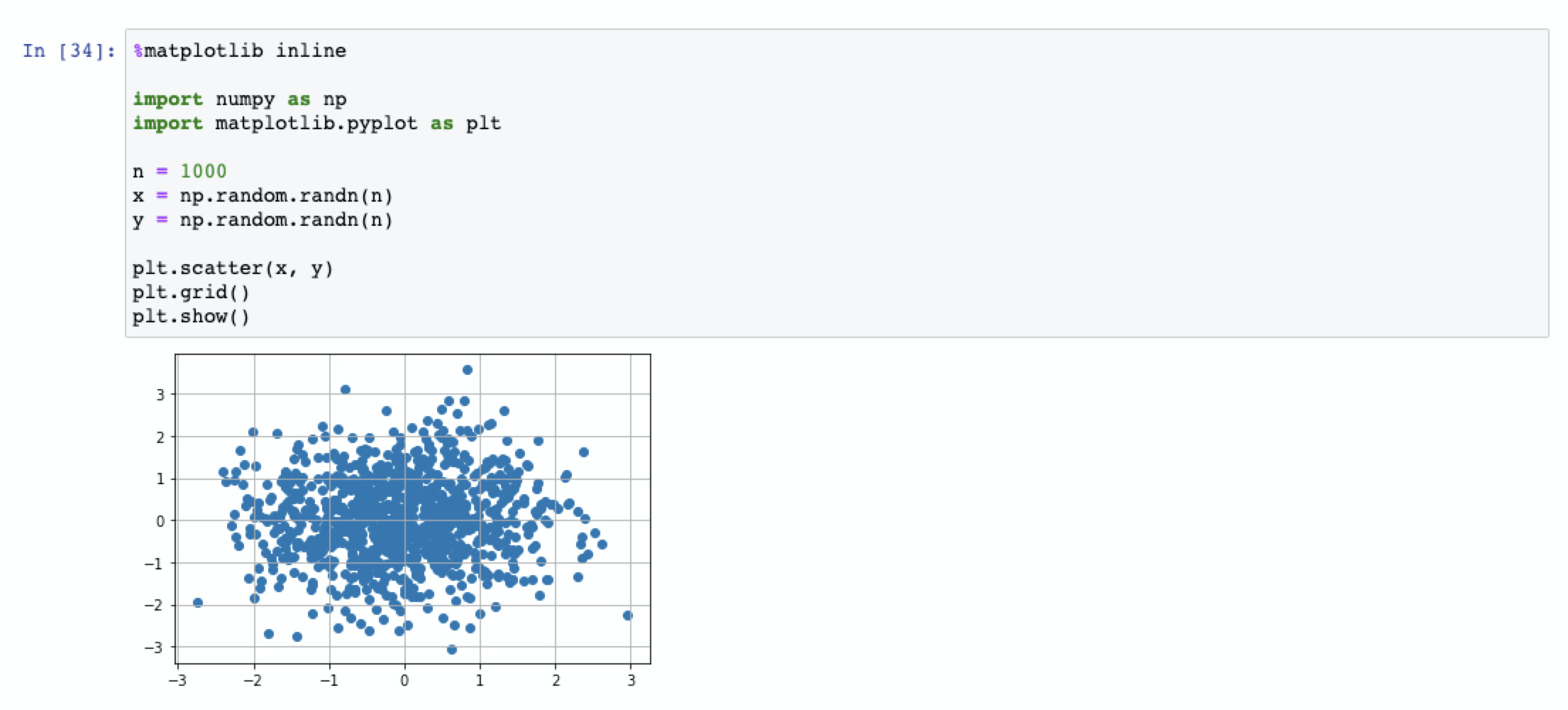 random.randn()함수는 정규분포의 확률에 따라 난수를 발생시킵니다.
