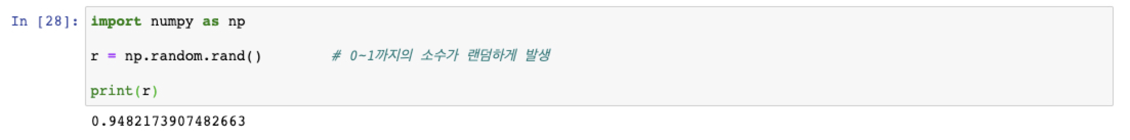 r = np.random.rand() # 0~1까지의 소수가 랜덤하게 발생