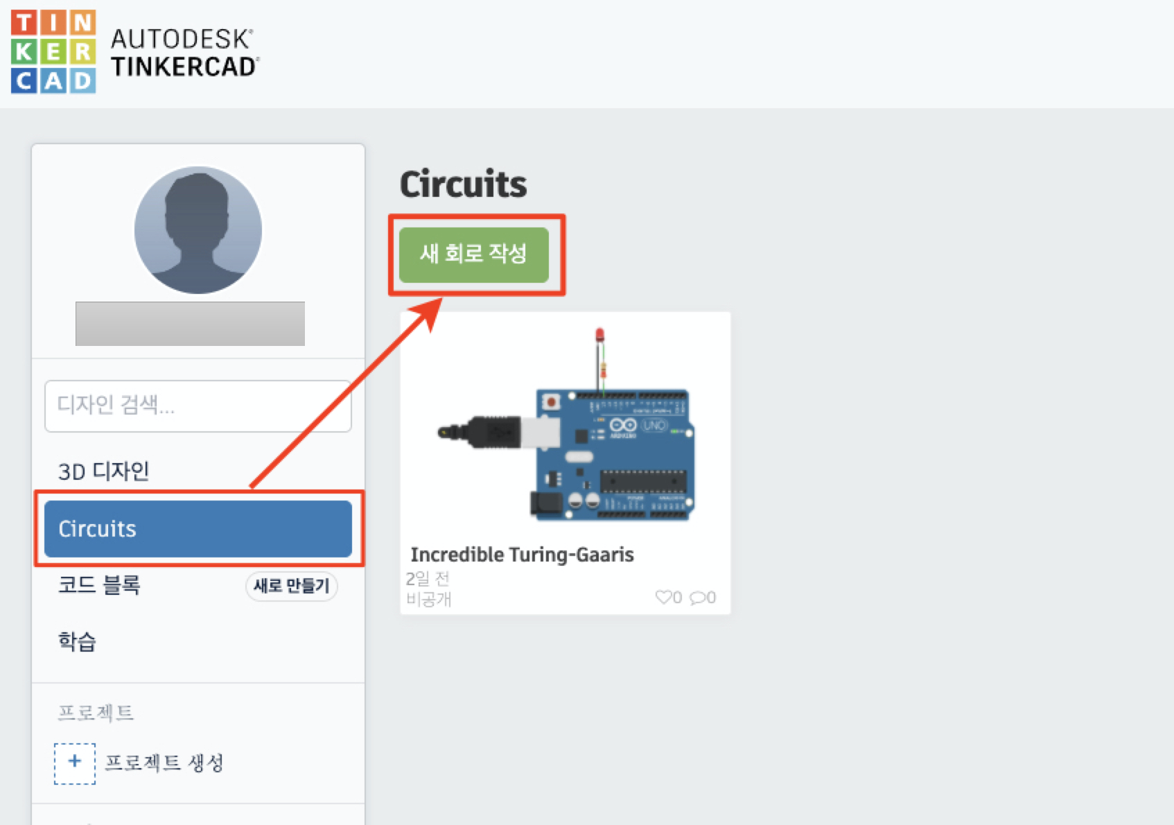 좌측 사이드바에서 Circuits 를 클릭하시고 새 회로 작성 버튼을 클릭합니다.