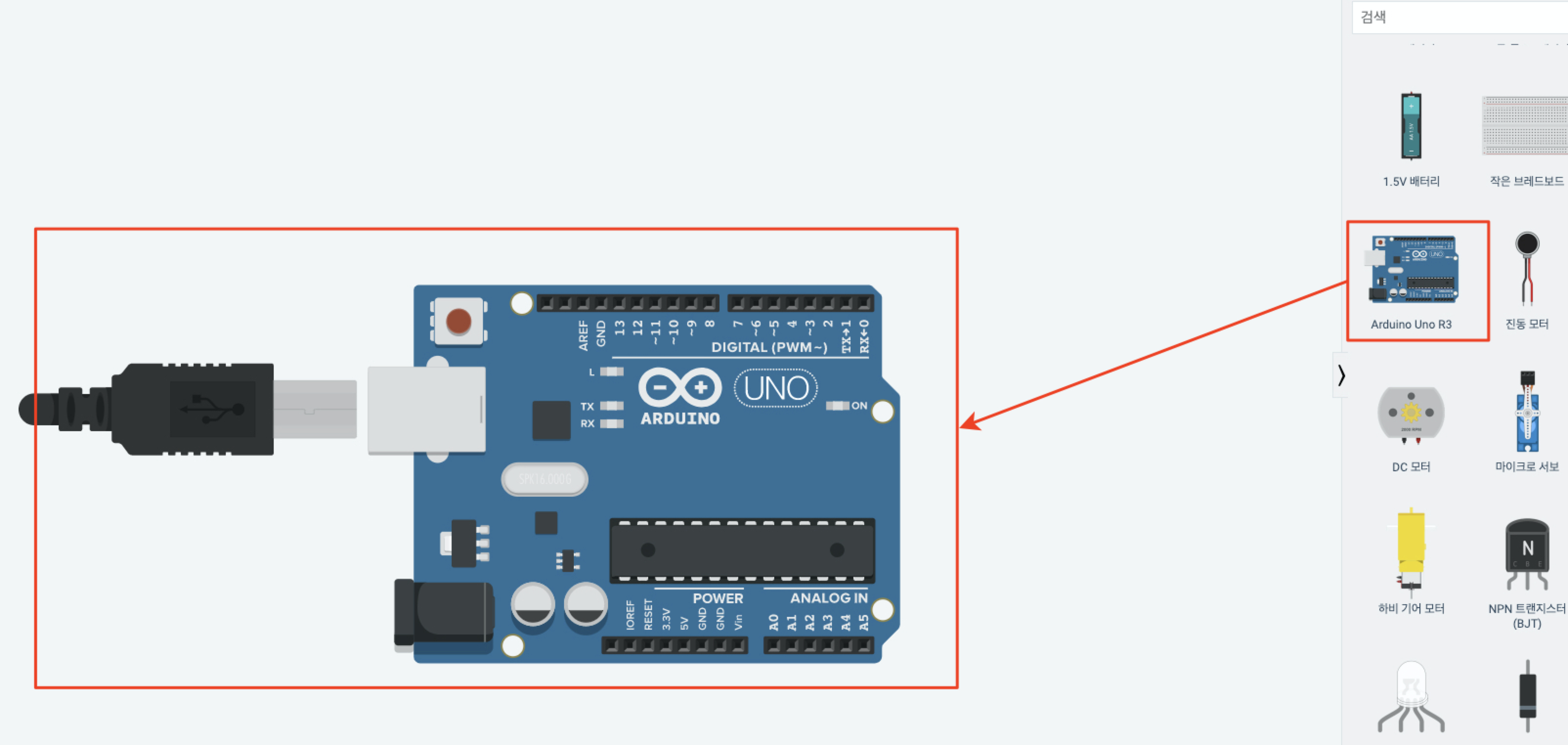 우측에 부품 리스트에서 아두이노를 찾아서 위치시킵니다.