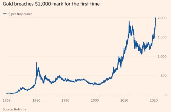 [파이낸셜뉴스] 금 가격 추이(온스당 달러) ; 1968년 이후 /사진=리피니티브, FT 금 가격이 4일(이하 현지시간) 사상처음으로 온스당 2000달러 선을 뚫었다. 신종 코로나바이러스 감염증(코로나1)에 ��