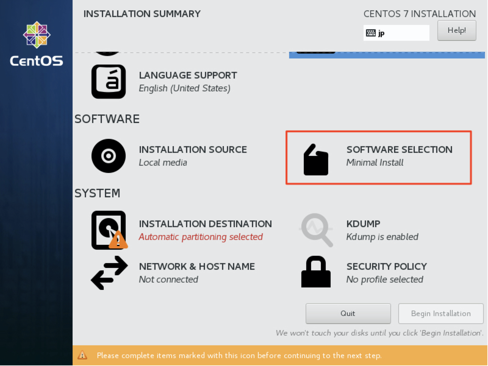 8. 다시 설정화면으로 돌아갑니다. SOFTWARE SELECTION 에 대해서는 설정을 하지 않고 Minimal Install 로 진행합니다. 서버를 운영하다보면 보안 차원에서 유지보수를 고려하여, 필요한 소프트웨어를 필요할 때에 한정해서 설치하여, 가능한 한 최소한의 시스템 구성을 하는 것이 바랍직합니다.