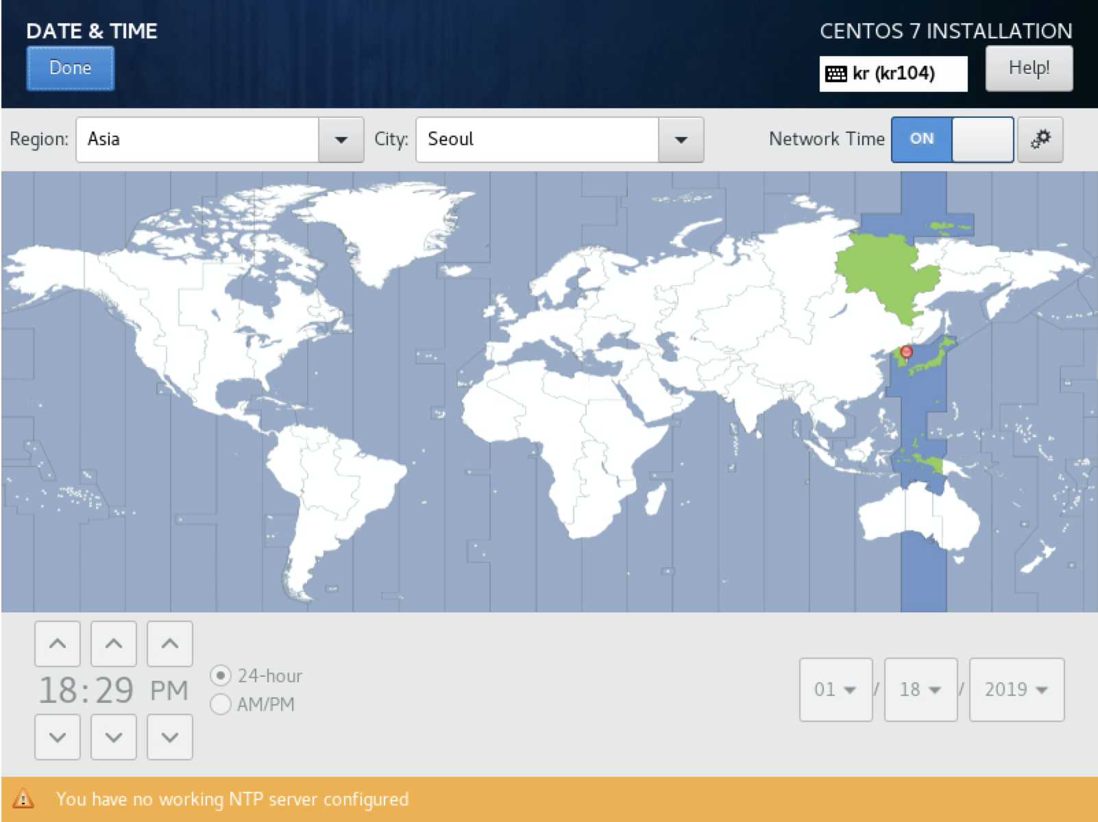 7. 지도상에서 위치를 클릭하거나 드롭다운 버튼에서 Region : Asia와 City : Seoul을 선택하고 Done을 클릭합니다. (타임존은 각자의 위치에 맞게 설정하시기 바랍니다. 혹시 한국이 아닌신 분은... ㅎㅎㅎ)