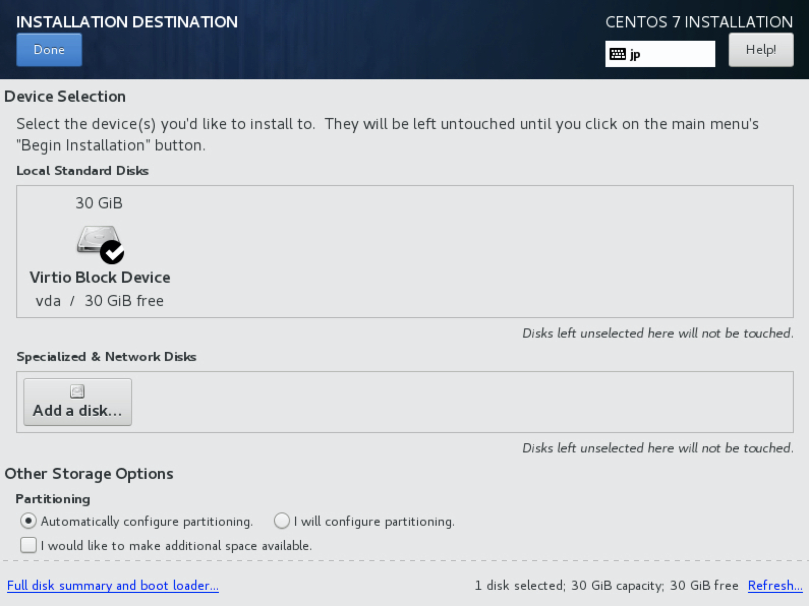 10. 설치가 진행될 하드디스크를 선택합니다. 하드디스크를 선택한 후 Done 버튼을 클릭합니다. 파티션 구성은 자동으로 구성됩니다.