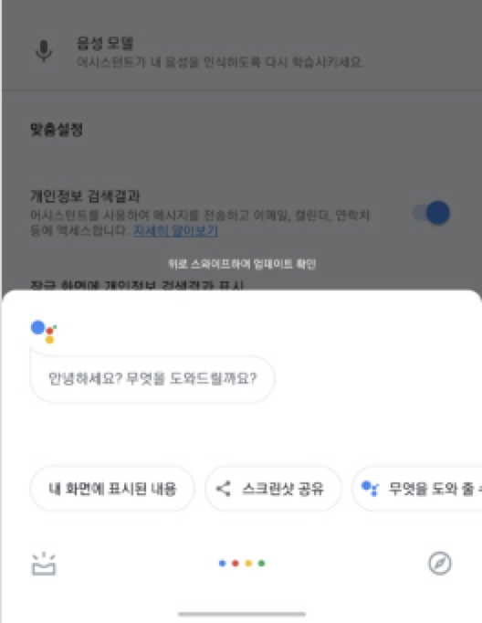 "오케이 구글"!!! 이라고 부르면 아래 화면처름 밑에서 구글 어시스턴트가 실행됩니다.