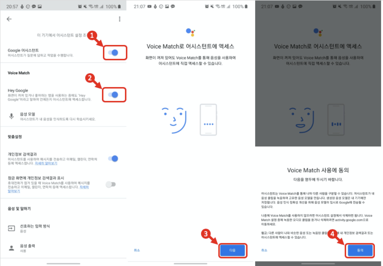구글 어시스턴트를 활성화 시키고 음성 모델을 학습시켜야 합니다.