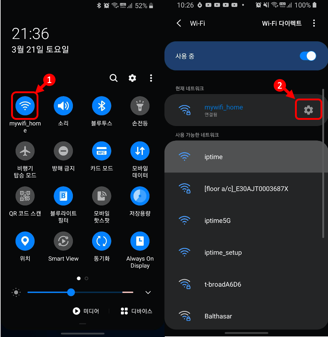1. 와이파이 설정 -> 2. 설정 아이콘 터치