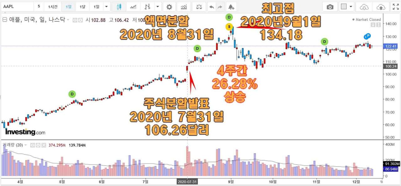 예를들어 애플은 2020년 7월31일 1/4로 액면분할 뉴스가 있었다.