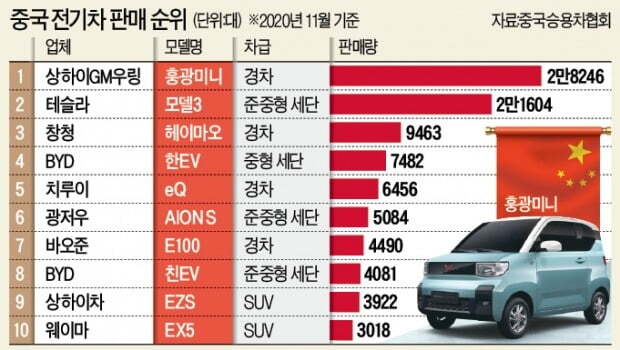 480만원 '미니'로 테슬라 꺾은 中 전기차, 中 토종 전기차 급부상 상하이GM우링 '훙광미니' '모델3' 제치고 넉달째 판매 1위 농어촌까지 보급 빨라졌지만 '애국소비' 열풍에 테슬라 주춤 경차·SUV도