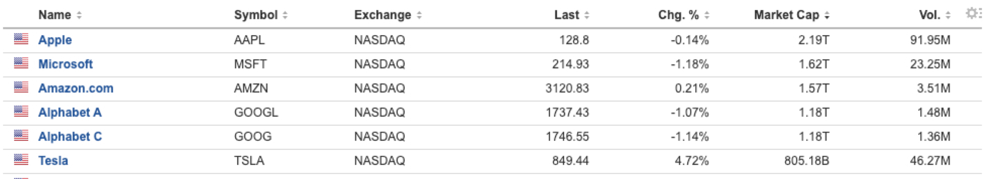 애플은 0.14% 소폭하락했고 테슬라는 4.72% 크게 상승했으며 아마존도 0.21% 상승했다.
