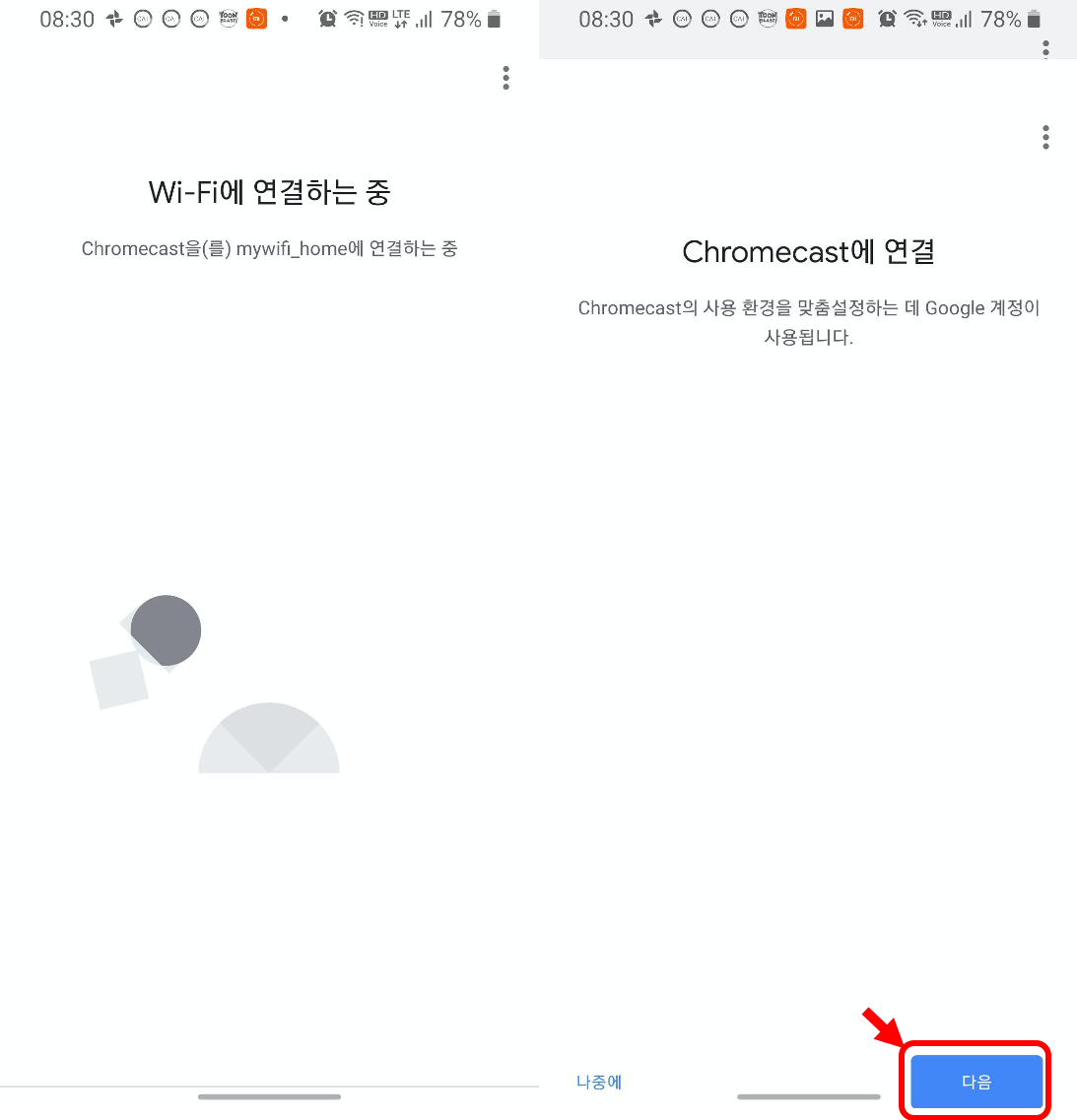 와이파이 연결 설정이 완료되면 다음으로 넘어가시면 됩니다.