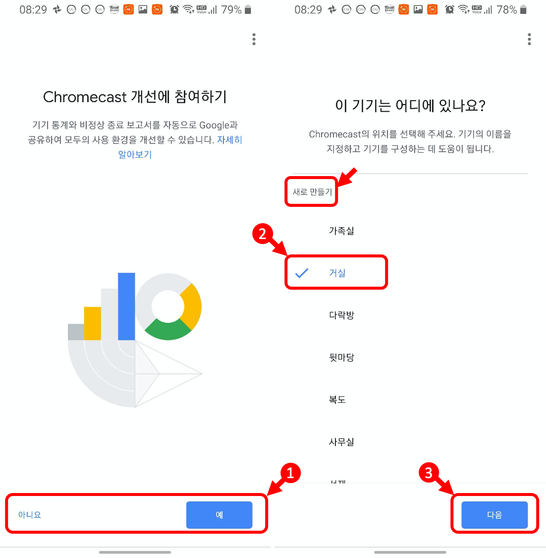 1. "예" -> 2. "거실" 선택 -> 3. 다음