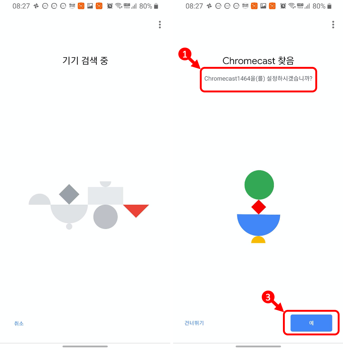 기기 검색 중 -> 1. Chromecast 찾음(TV와 대조) -> 3. 예