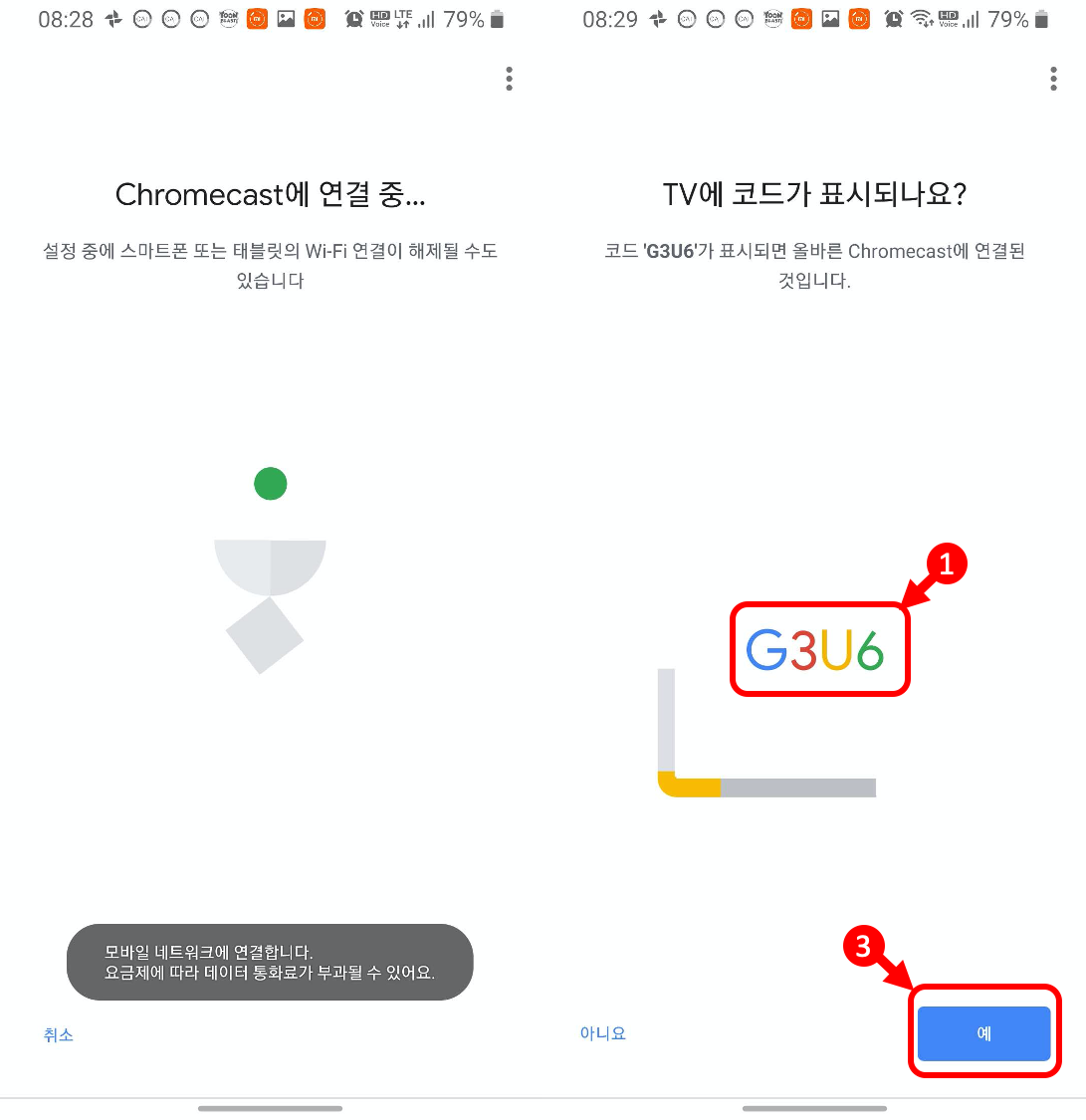 Chromecast에 연결중... -> TV에 코드가 표시되나요? -> 1. 코드 확인 -> 2. TV에 코드와 같은지 확인 -> 확인