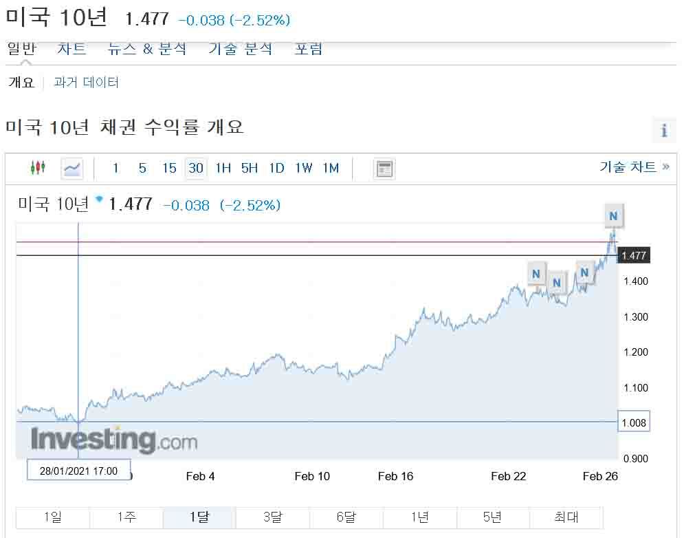 2021년 2월 26일 12시 현재 1.4%대까지 떨어진 국채 금리 때문에 주식 시장은 약간의 안정을 찾고 있다.