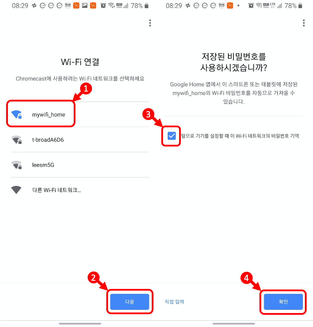 Wi-Fi연결 -> 1. 와이파이 선택 -> 다음 -> 와이파이 비밀번호 저장 설정 -> 다음