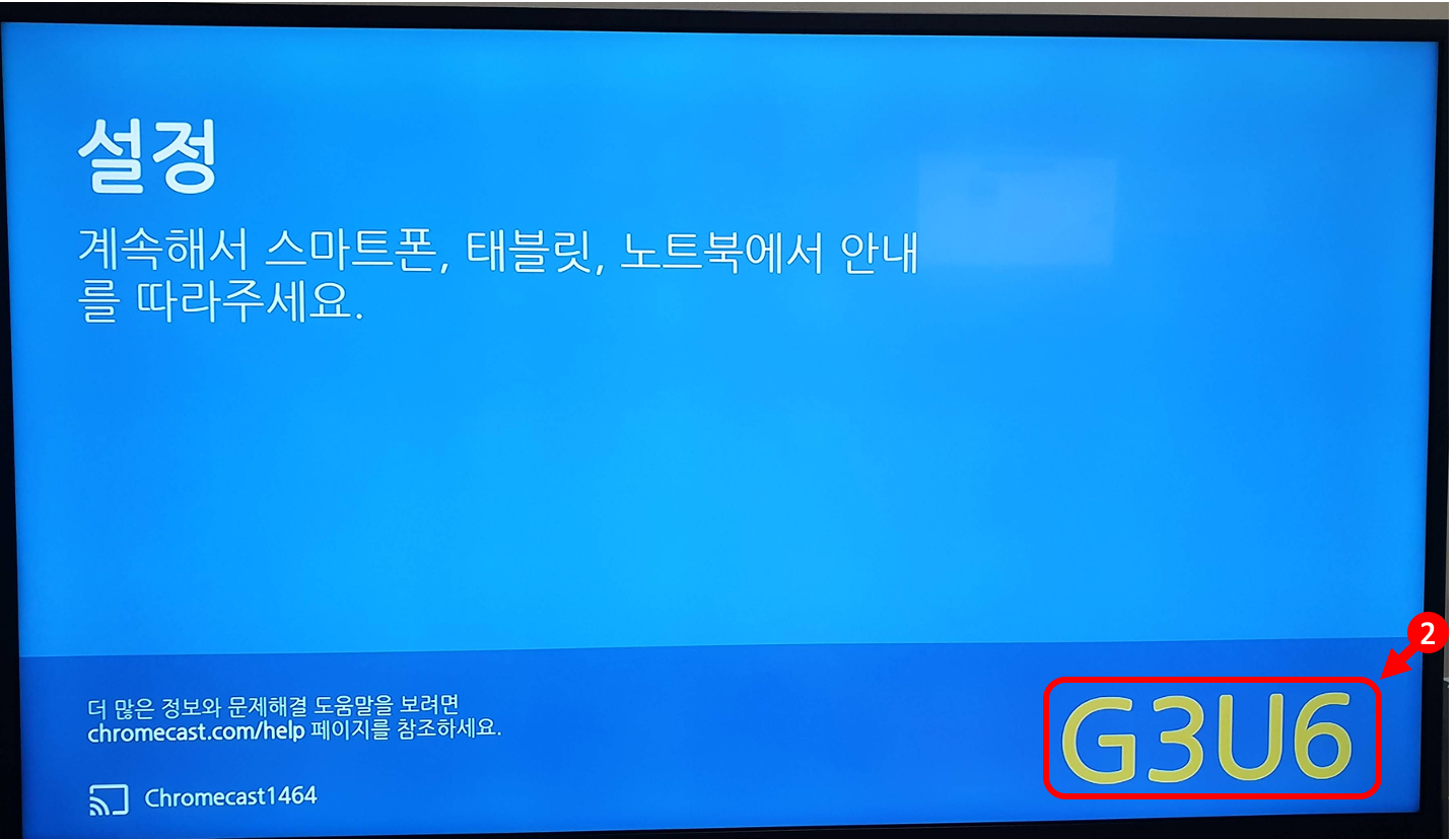 1. "Chromecast 찾음 화면"이 나옵니다. TV화면 과 표시한 부분의 숫자가 맞는지 확인후