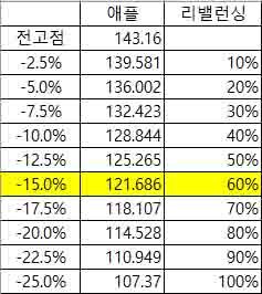 예를 들어 애플이 전고점 대비 20% 떨어진 지점에서 나스닥 -3%가 떴을 경우 즉 100달러가 전고점이라고 치자