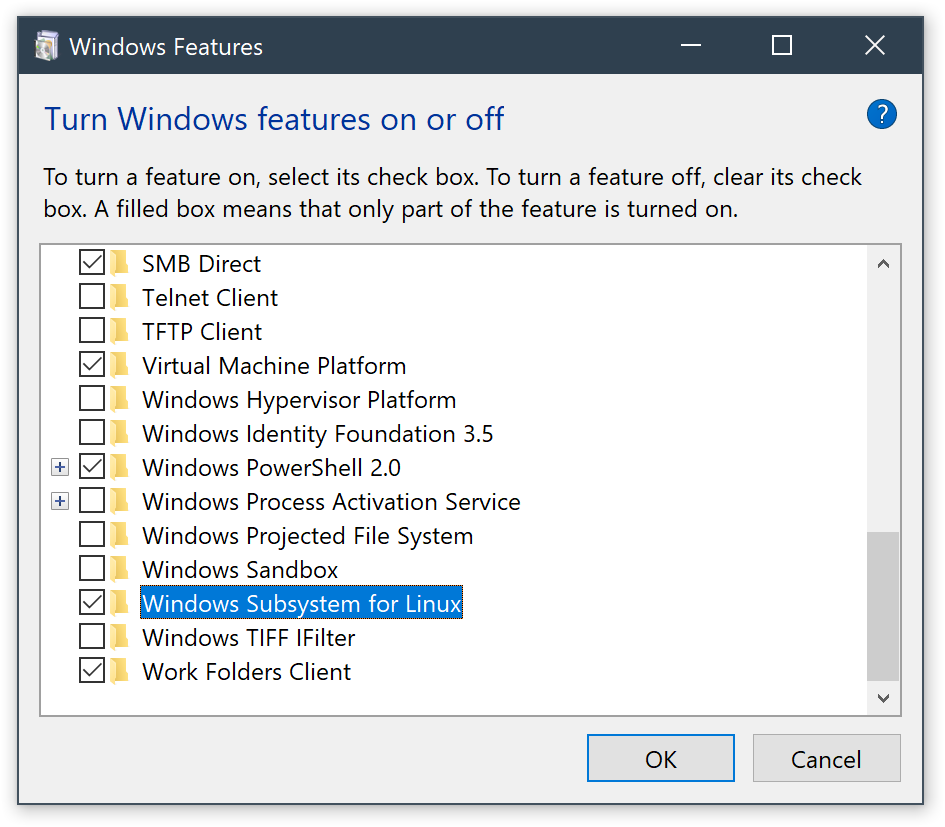 아래와 같이 Windows Subsystem for Linux 체크합니다.