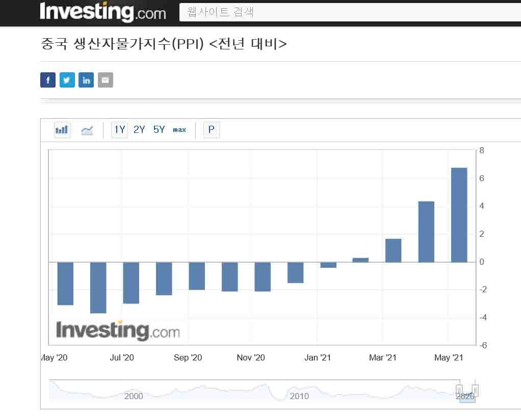 중국의 생산자 물가지수는 바닥을 기다가 2021년 2월을 기점으로 올라가고 있다.