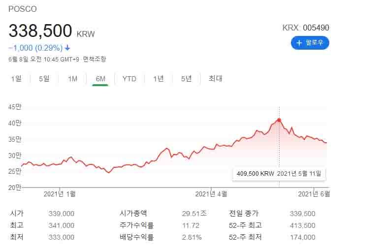 포스코 주가는 5월 11일 409,500원이 정점이었고 이후 17% 조정받아서 6월 8일 현재 338,500원이다.