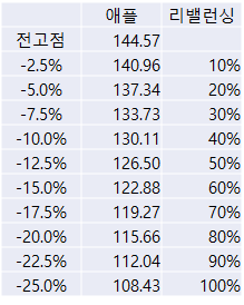 2021년 7월 8일 애플 리밸런싱 표(전고점 144.57달러)