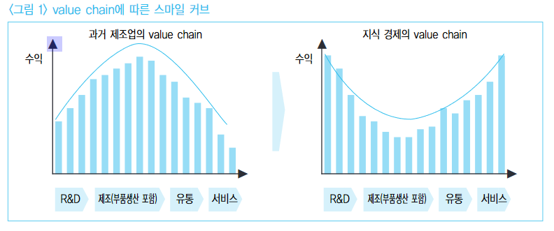 과거에는 제조업의 value chain상 제조, 조립 과정에서 높은 부가가치를 얻을 수 있고, 연구 및 부품 생산, 서비스에서는 상대적으로 낮은 부가가치를 얻을 수 있었다.