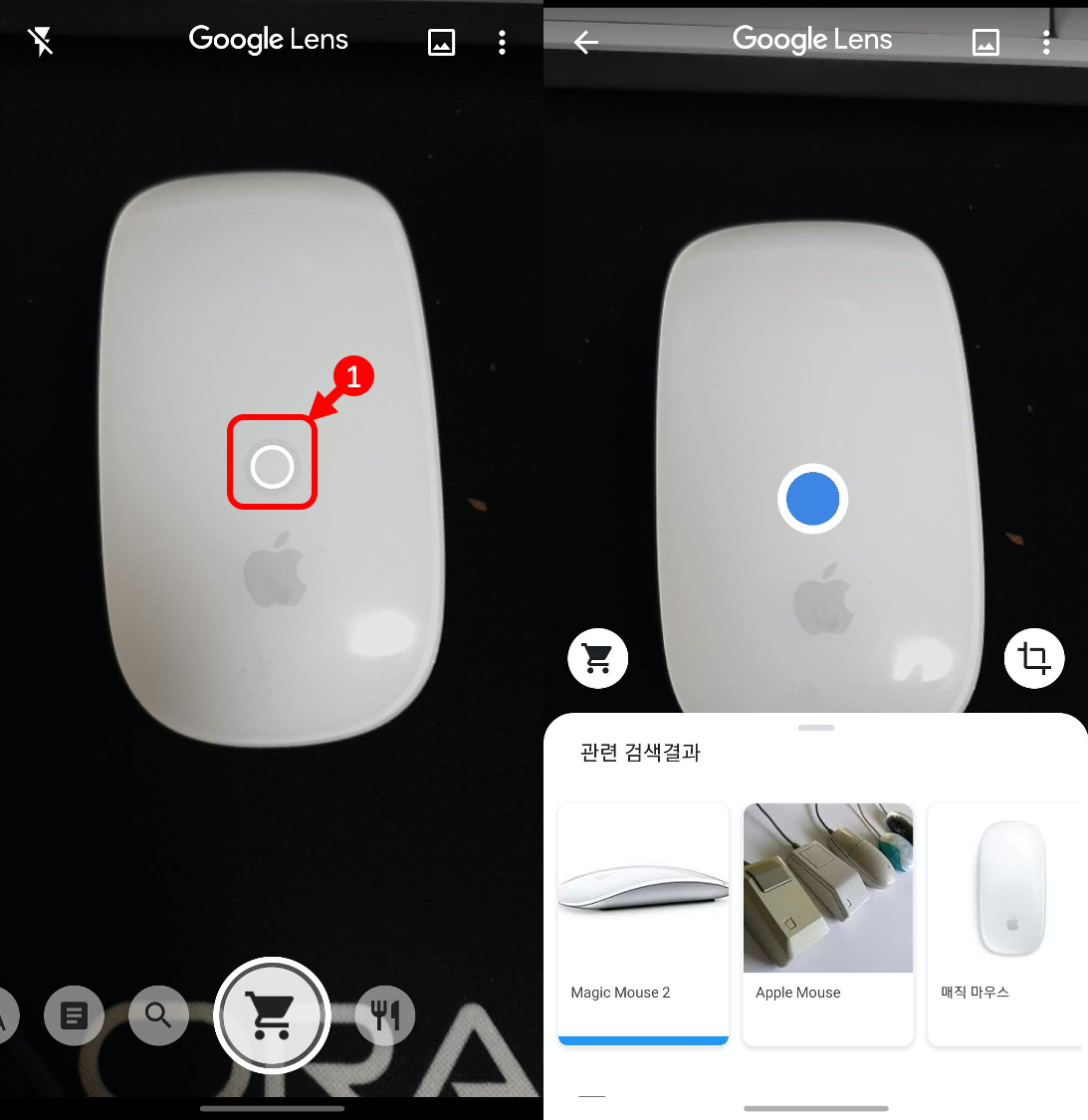 물체를 인식하면 동그라미가 생기므로 터치하면 검색해줍니다.