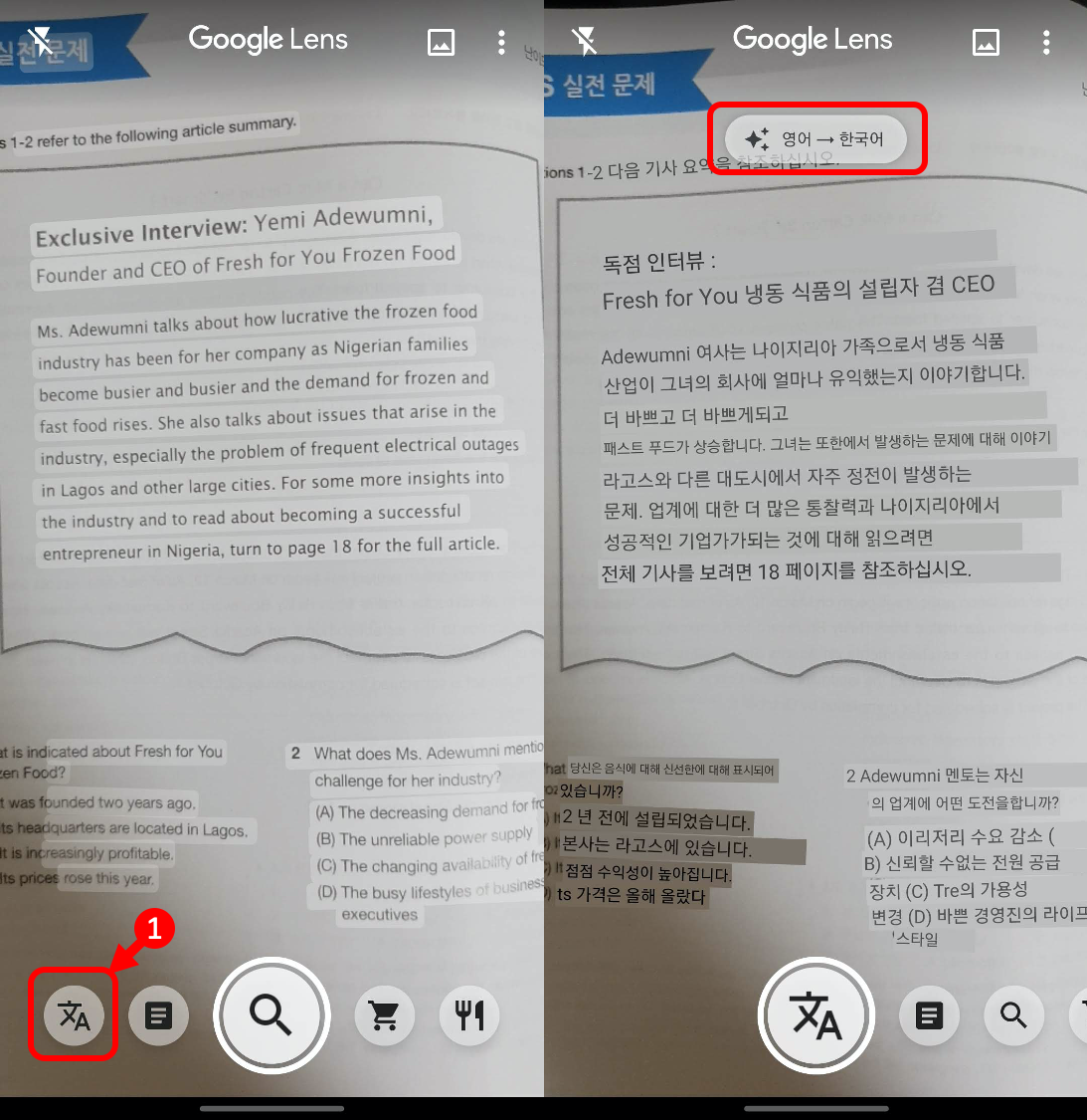카메라 -> 문자 번역 버튼 -> 문자들 자동 번역됨
