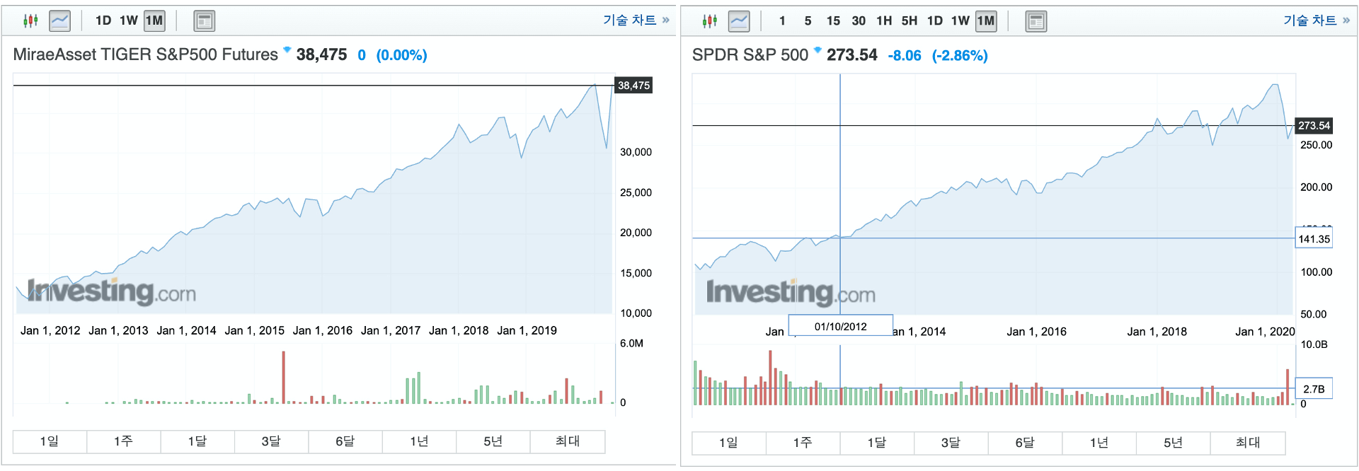 위 상품 3가지는 미국 S&P500을 추종하는 ETF 상품이기 때문에 미국 ETF인 SPY, VOO, IVV와 차트의 움직임이 거의 비슷합니다.