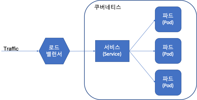 트래픽이 로드밸런서를 통해 쿠버네티스 내부 클러스터의 노드에 리다이렉션 합니다. 그런 다음 노드의 요청을 처리하고 응답을 다시 전달합니다.