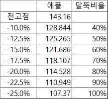 애플이 전고점인 143.16달러에서 -2.5%가 빠질 때마다 6번을 10%씩 팔아서 121달러가 되었을 때 60%를 현금화 시킨 상태가 되엇을 것이다.