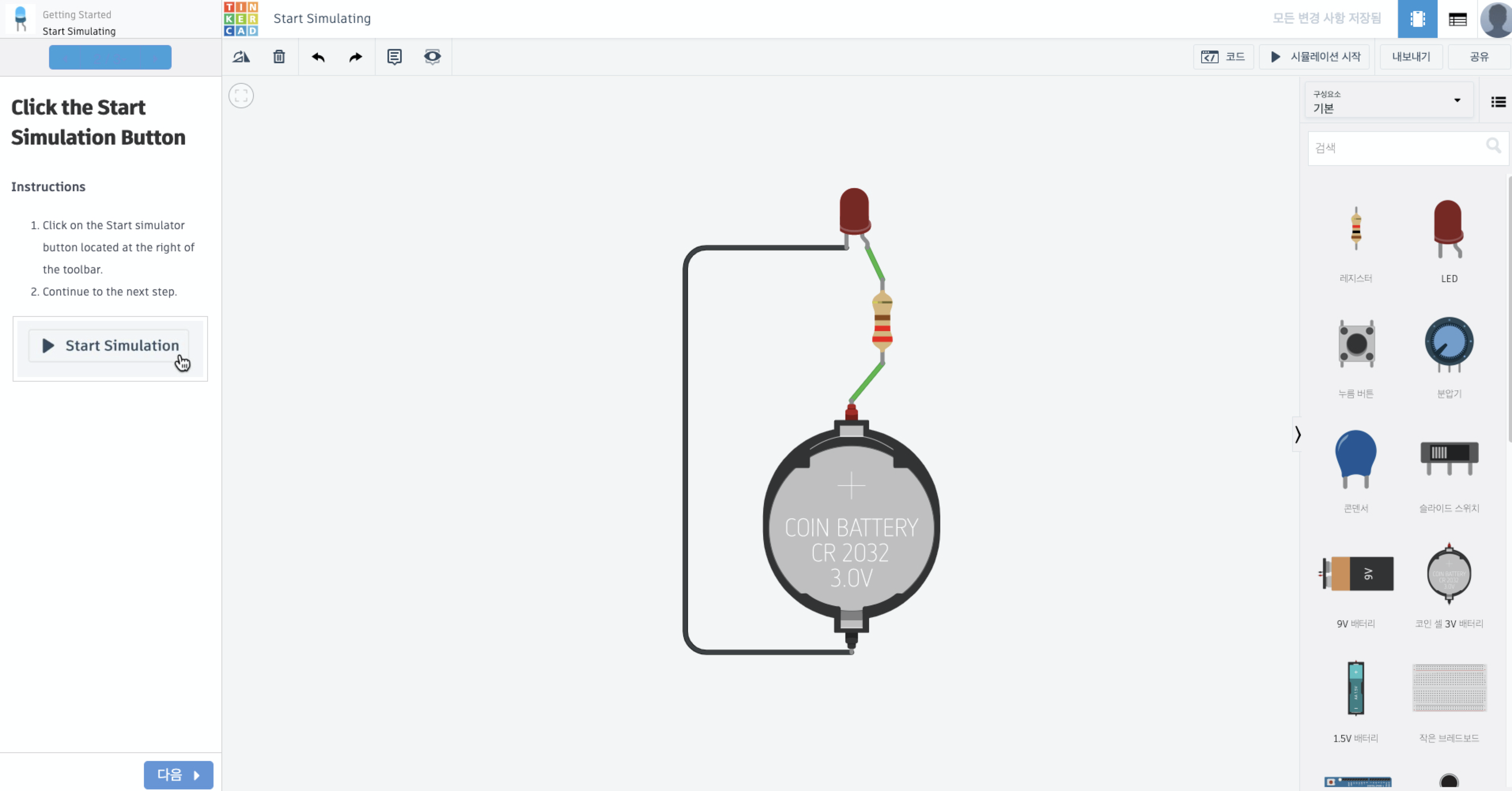 오른쪽 상단에 시뮬레이션 시작 버튼을 클릭하면