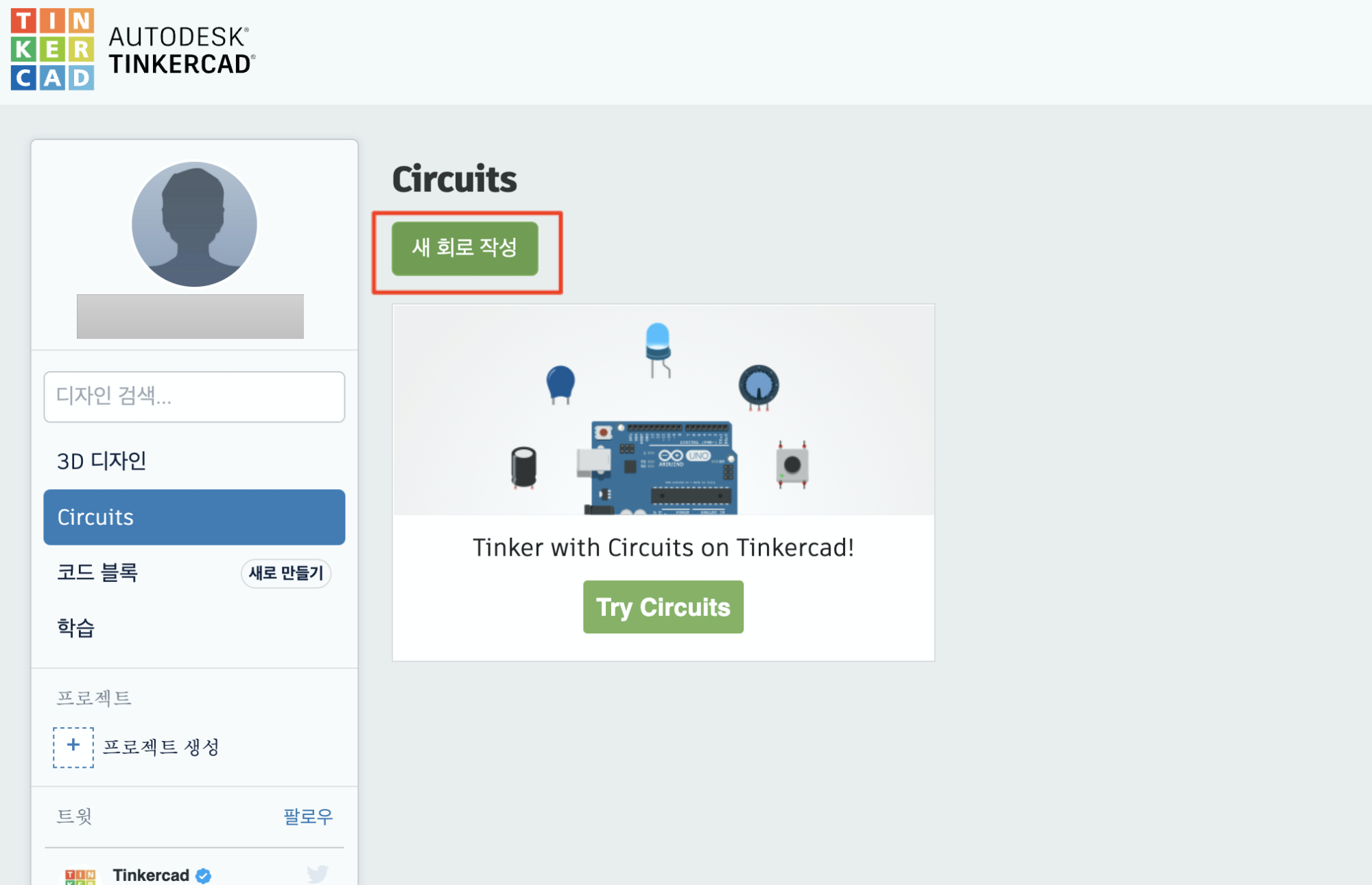 새 회로 작성 버튼을 클릭합니다.