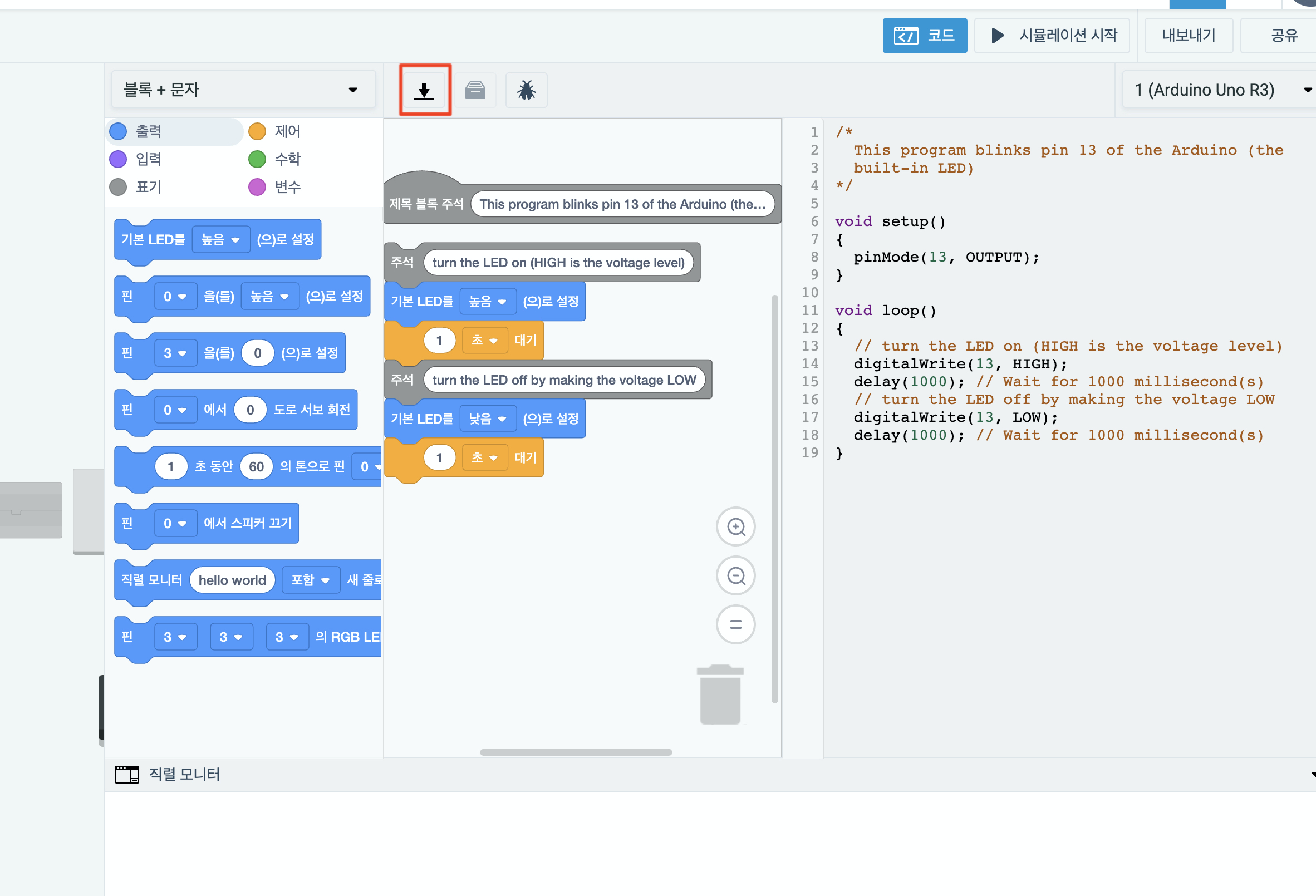 위에 표시한 아래로 향하는 화살표를 클릭하면 아두이노 보드에 업로드 가능한 형태의 파일을 다운로드 할 수 있습니다.
