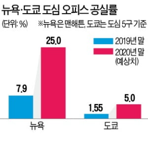 재택근무 확산과 사무실 축소 움직임은 주요 도심 오피스빌딩 공실률에서도 확인된다. 지난달 말 도쿄 도심 오피스빌딩 공실률은 1.97%로, 연초보다 0.42%포인트 올랐다. 일본 부동산시장은 연말 공실률이 5%까지 뛸 것으로 예상하고 있다. 국제 신용평가사 무디스는 상반기 11.9%인 뉴욕 맨해튼의 공실률이 연말 25%까지 오를 것으로 내다봤다. 중국 베이징 도심의 2분기 오피스빌딩 공실률도 14%로, 전 분기보다 2.7%포인트 올랐다.
