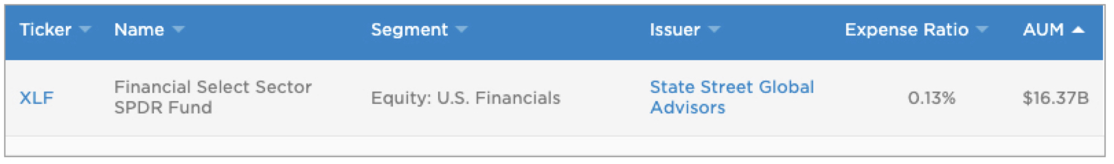 - VFH : Vanguard Financials ETF - IYF : iShares U.S. Financials ETF - FNCL : Fidelity MSCI Financials Index ETF - IYG : iShares U.S. Financial Services ETF - IXG : iShares Global Financials ETF