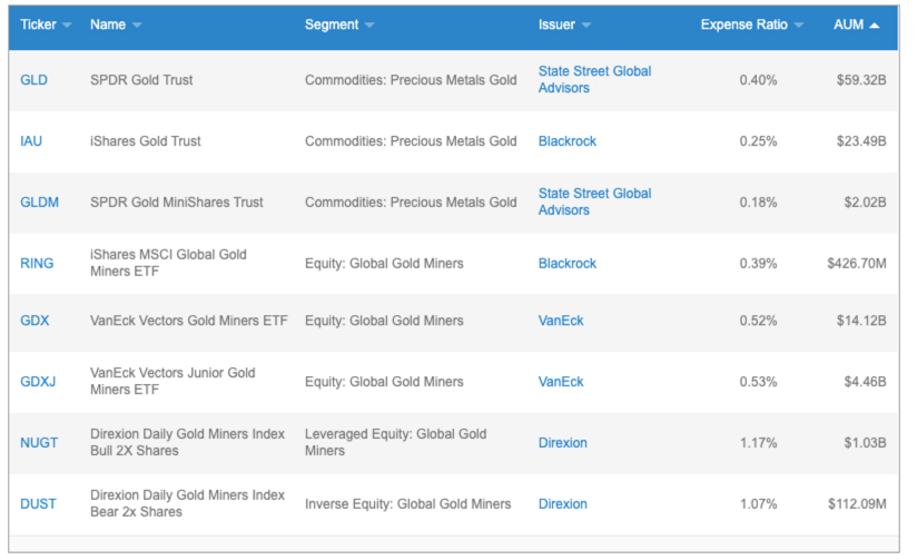 - GLD : SPDR Gold Trust - GLDM : SPDR Gold MiniShares Trust - IAU : iShares Gold Trust - RING : iShares MSCI Global Gold Miners ETF - GDX : VanEck Vectors Gold Miners ETF - GDXJ : VanEck Vectors Junior Gold Miners ETF - NUGT : Direxion Daily Gold Miners Index Bull 2X Shares(+3배) - DUST : Direxion Daily Gold Miners Index Bear 2x Shares(-3배)